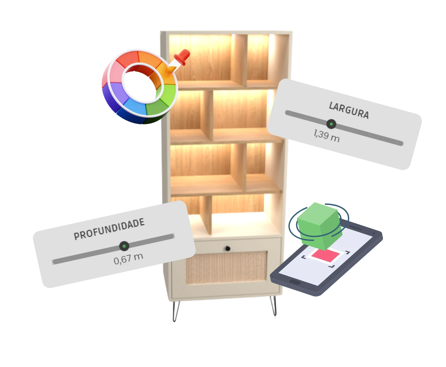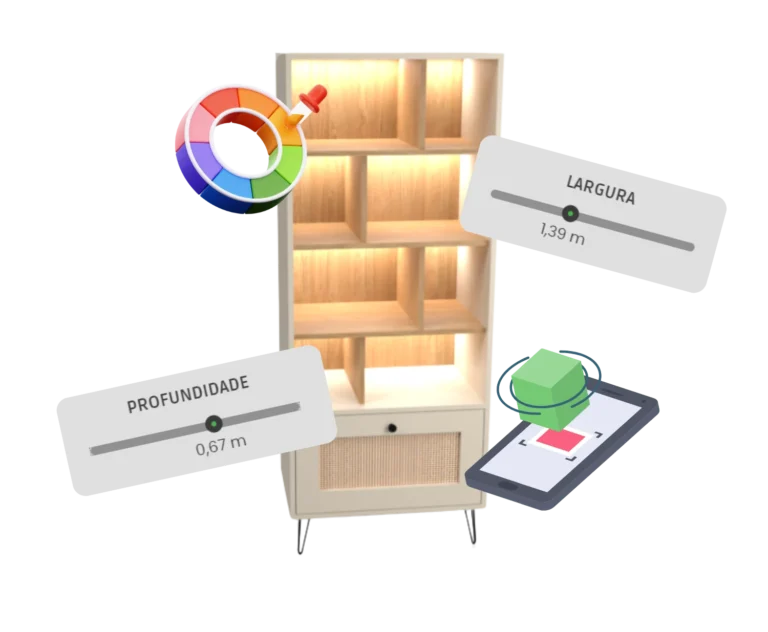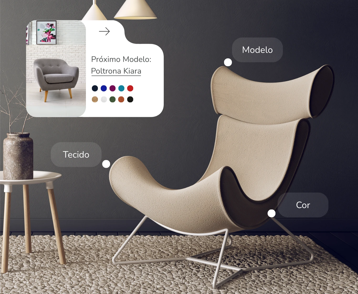 Crie combinações únicas de cores, tecidos e designs, e permita que seus clientes projetem os móveis em seus próprios espaços usando realidade aumentada. Perfeito para eliminar dúvidas na hora da compra, reduzir devoluções e aumentar o ticket médio, oferecendo um ‘test-drive’ digital do móvel perfeito, no ambiente real do cliente