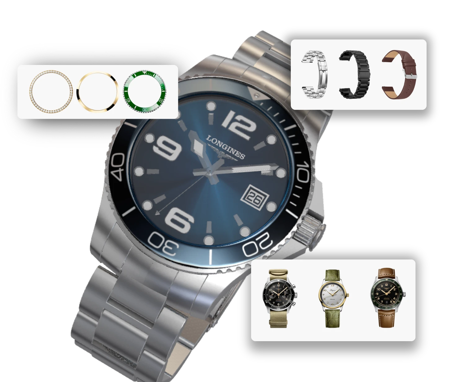 Visualize materiais, mostradores e pulseiras em tempo real — direto no navegador, sem instalações. Perfeito para marcas premium: transforme curiosidade em desejo e acelere a decisão de compra com um toque de luxo digital